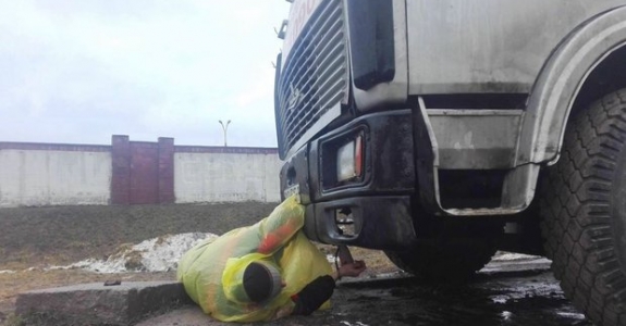 “Буду лежать, пока не сдохну“. Один из протестующих у Куропат приковал себя наручниками к МАЗу