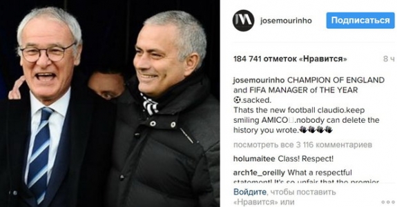 Моуринью поддержал уволенного из “Лестера“ Раньери