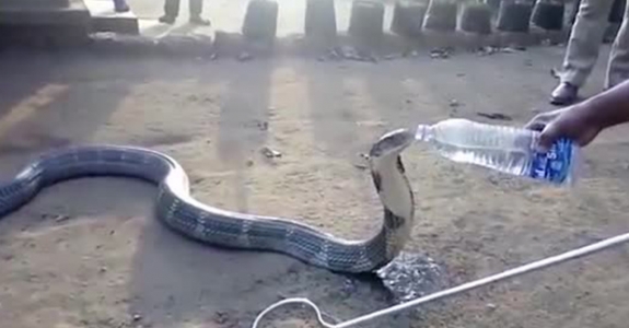 В Индии страдавшую от жажды дикую кобру напоили водой из бутылки