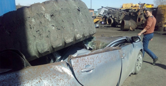 Видеофакт: взорвавшееся колесо от БЕЛАЗа расплющило Toyota в Кузбассе