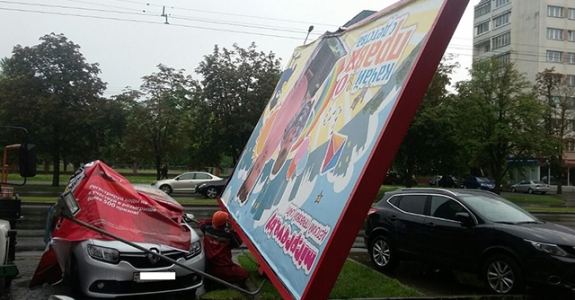 Сильный ветер в Минске повалил рекламный щит на припаркованную машину