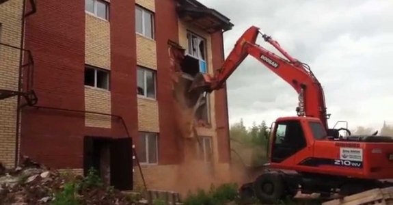 На экскаватор упал дом. Водитель чудом выжил. Видеофакт