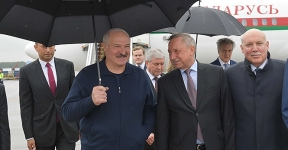 Один под зонтом. Лукашенко направляется к вертолету, который доставит его на остров