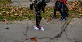 Фотофакт. ОМОНовец вытирает ноги о бело-красно-белый флаг