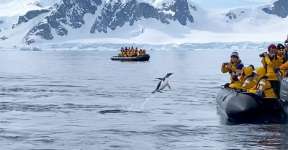 Голодные косатки преследовали пингвина. Но он их переиграл, запрыгнув в лодку к туристам