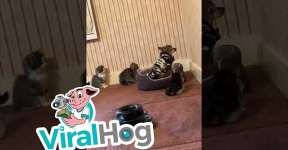 Видеохит: четверо котят зажали в углу удивленного пса. Собака предпочла сразу сдаться
