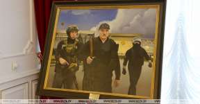 Картину, где изображен Лукашенко с автоматом и Колей, выставили во Дворце Независимости