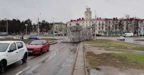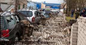 От сильного ветра в Барановичах обрушился кирпичный забор. Повреждены шесть автомобилей