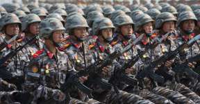 Два десятка северокорейцев в окопе, задрав головы, смотрят, как на них падает боеприпас