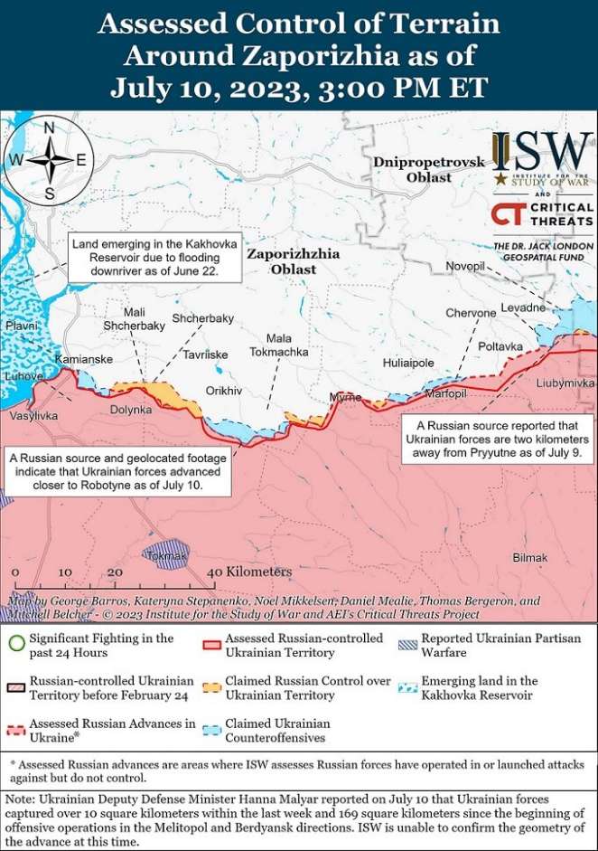 Один из российских военных блогеров утверждал, что 10 июля 34-я мотострелковая бригада якобы «отразила атаку» ВСУ в районе Великой Новоселки. А в районе Урожайного обороняются оккупанты из подразделения «Каскад» и еще одного неустановленного пехотного формирования, информируют аналитики Института изучения войны (ISW).