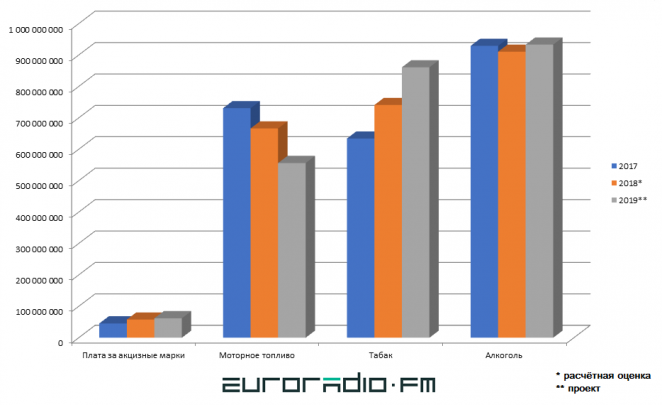 Excise revenues on alcohol in the draft for 2019 should amount to 933.1 million BYN, fuel - 556.2 million BYN, tobacco - 860.8 million BYN. Another 62 million BYN should come from the payment for excise stamps.