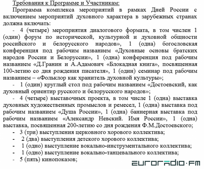 The selection of participants for "dialogue events" is to be taken very seriously. They should "support the ideas of promoting the values of Russia's spiritual culture and its role in preserving the historical and cultural heritage of Russia and Belarus.