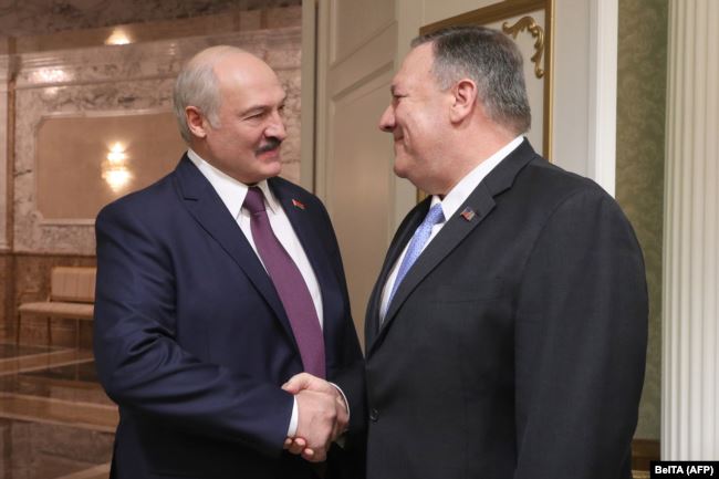 Belarusian President Alyaksandr Lukashenka (left) meets with U.S. Secretary of State Mike Pompeo in Minsk on February 1.