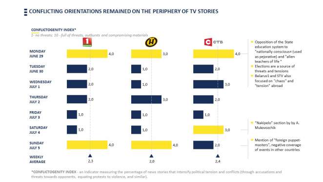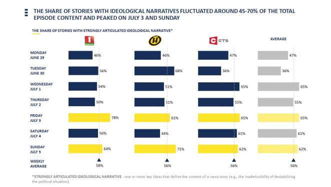The share of ideological content on state TV has varied from day to day and was strongest on Belarus’s Independence Day (July 3) as well as during the final Sunday broadcasts on July 5. The proportion of the news stories with strongly articulated ideological narratives ranged from 45% to 71%.