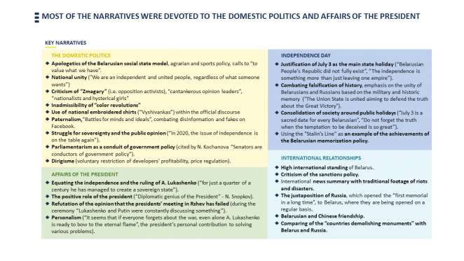The main ideologemes of state TV over the past week have been as follows: paternalism, the decisive role of the state in solving the problems of various areas of life (statism), the orientation towards assertive state regulation of the economy and public life (dirigisme), state patriotism and conservatism (“value what we have”), and a focus on the personal contribution of Alexander Lukashenko to solving the country’s problems and linking its independence with his rule (personalism). Auxiliary narratives were the focus on instability abroad and combating dangerous informational influences.