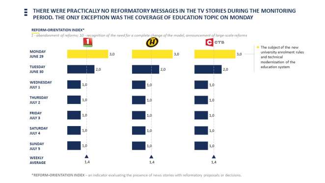 The Reform-orientation Index (which assesses recognition of the need to reform certain areas) in the state TV news stories was 3 out of 10 on the first day of monitoring. Then it decreased and did not exceed 1-2 points during the week.