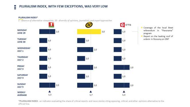 The Pluralism Index (which assesses the presence of alternative viewpoints, critical reports and statements) showed a similar dynamic. During the week, on average for the three channels, it did not exceed 2 out of 10 points, reaching 2 points only on the first and the last days of monitoring.