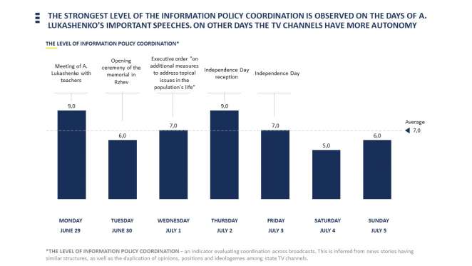 The Level of Information Policy Coordination (repeating story structures, duplication of opinions, positions and ideologemes) was high on all three channels (from 5 to 9 points on a 1-10 scale). This indicator’s value peaked on June 29 and July 2, when state TV abundantly covered events involving the president.