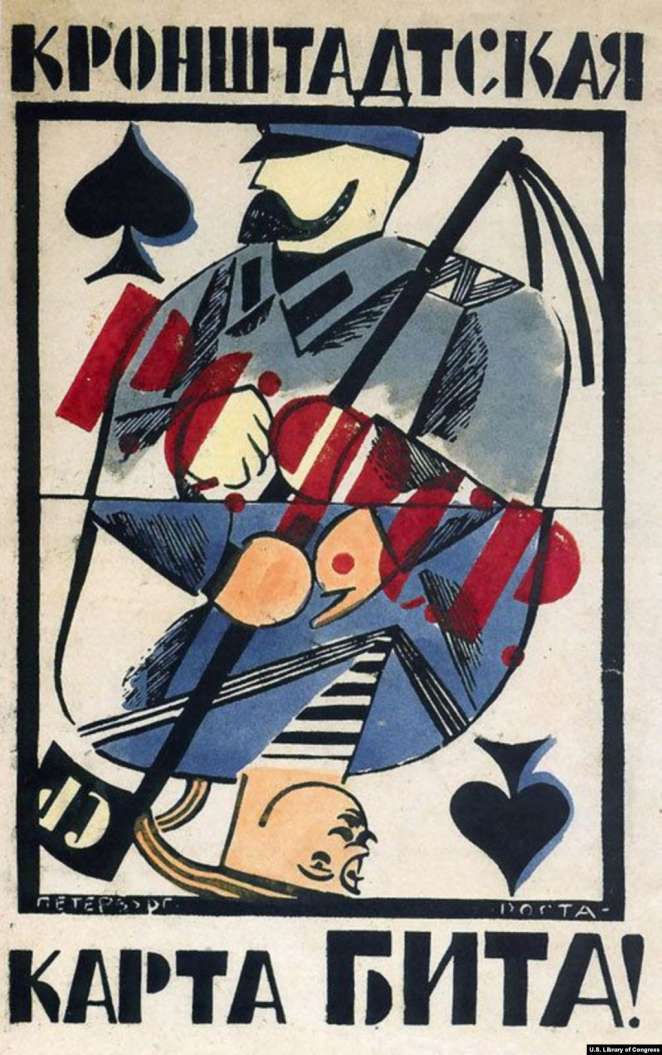4. That playing card placard may be inspired by this famous poster from the early days of communist rule in Russia referencing a sailor’s rebellion in Kronstadt, near St. Petersburg. The Kronstadt rebellion was an uprising against Lenin’s Bolsheviks. The uprising was brutally put down by the Red Army and more than 1,000 sailors were executed. The poster suggests duplicity by the sailors, declaring: “The Kronstadt card is beaten.”