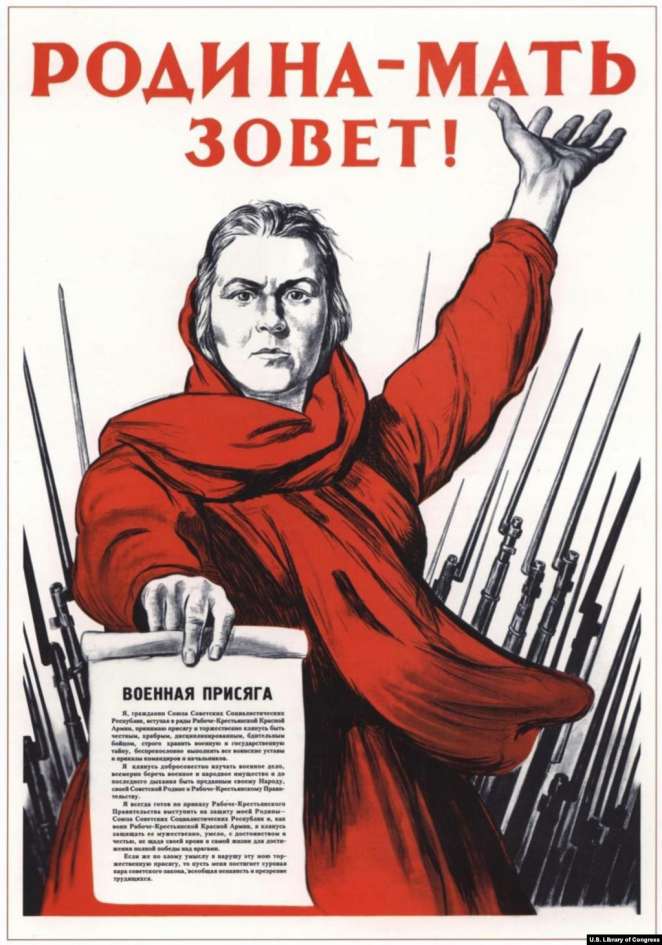 2. That opposition poster is derived from this iconic Soviet recruitment poster from World War II declaring “the motherland calls” and featuring a woman holding the Soviet soldier’s oath.