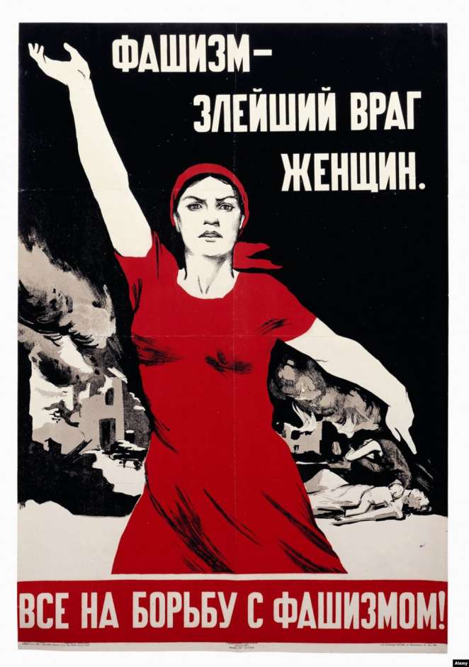 6. That sign is a play on this famous Soviet wartime propaganda poster declaring “Fascism is the most vicious enemy of women. All rise to fight fascism!"