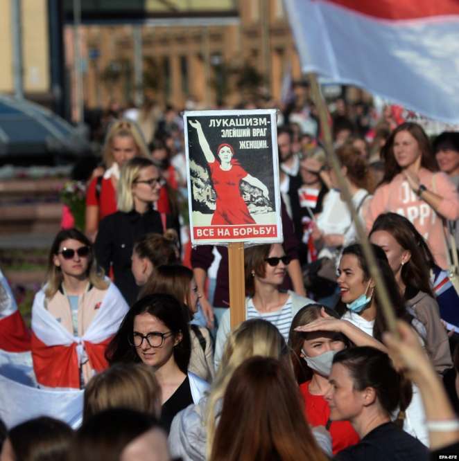 5. Women protesters hold a sign referencing the authoritarian rule of Lukashenka and declare: “Lukashism is the most vicious enemy of women. Everyone rise and fight.”