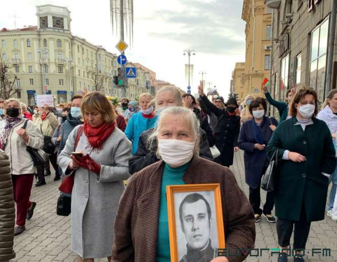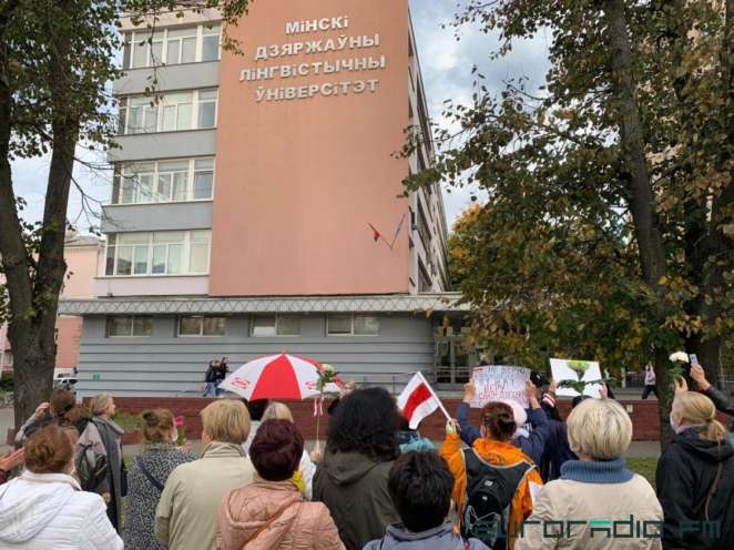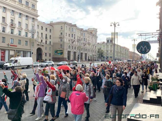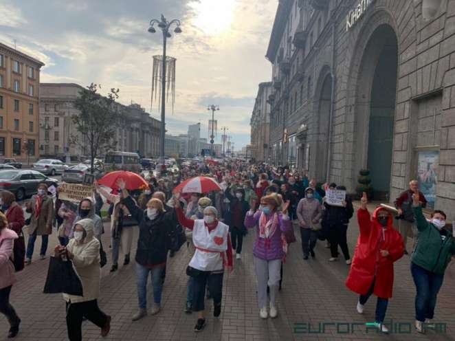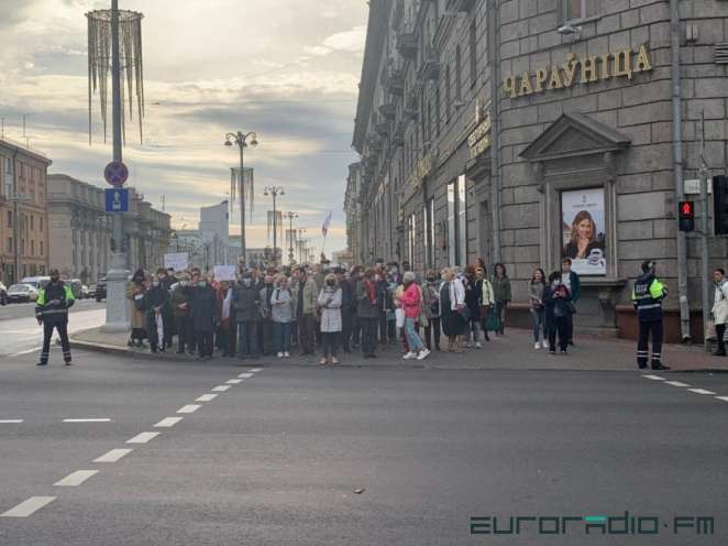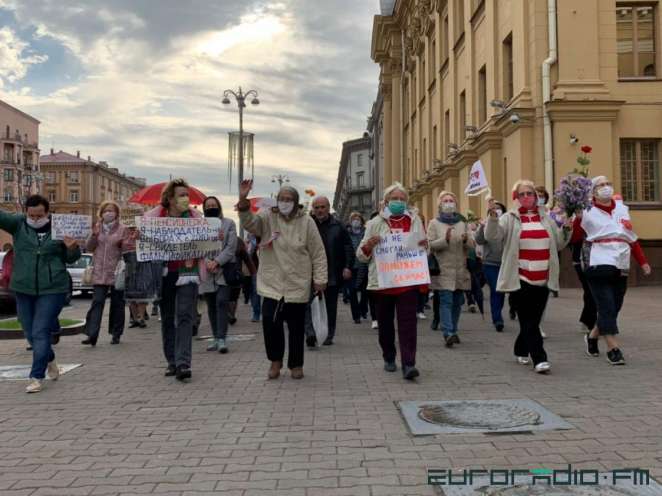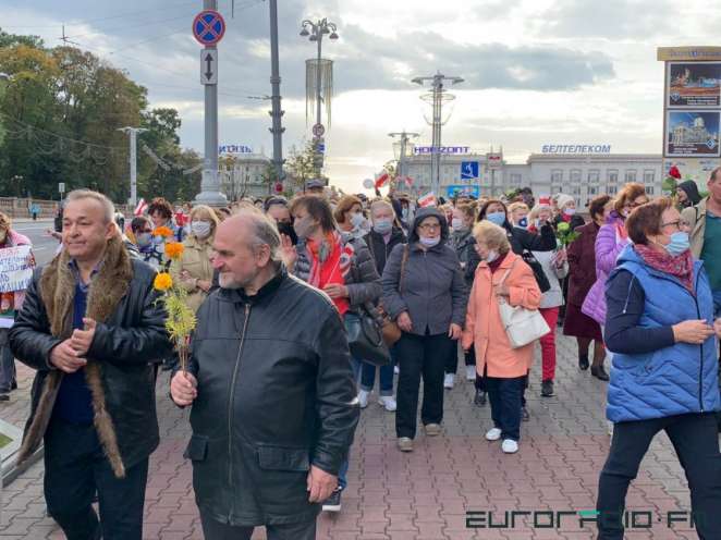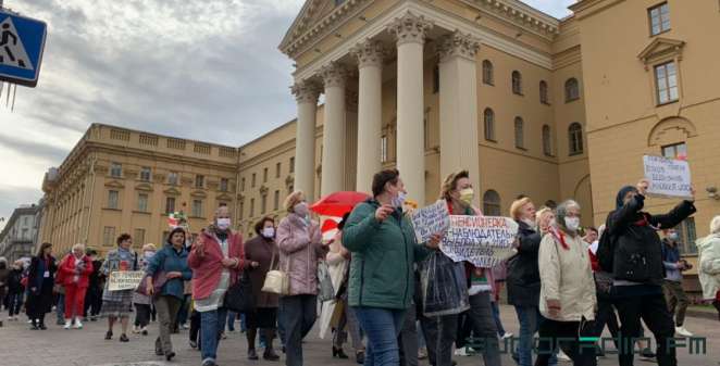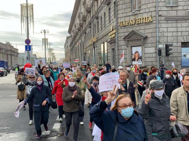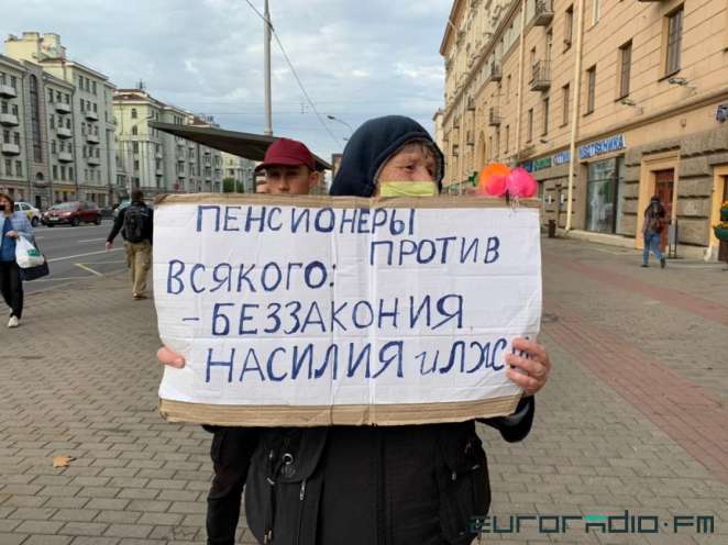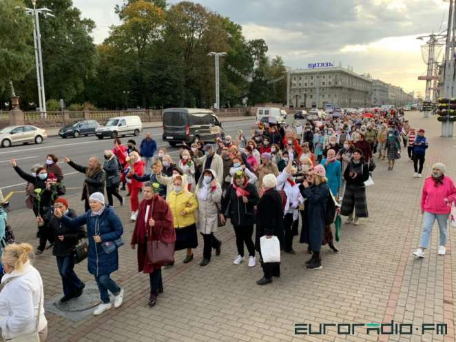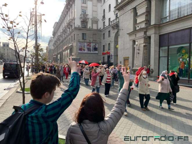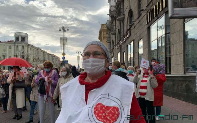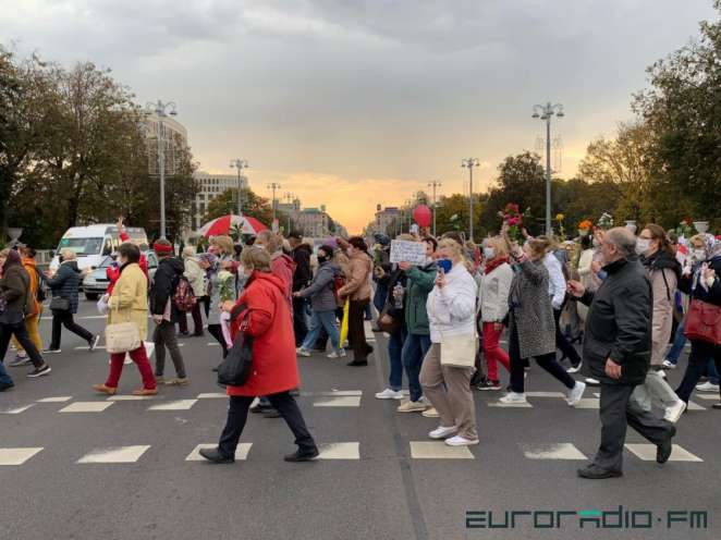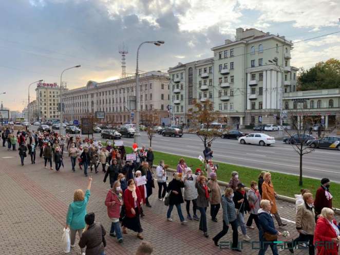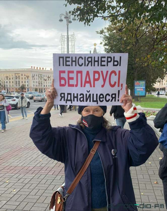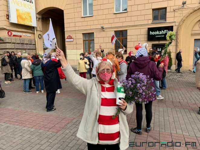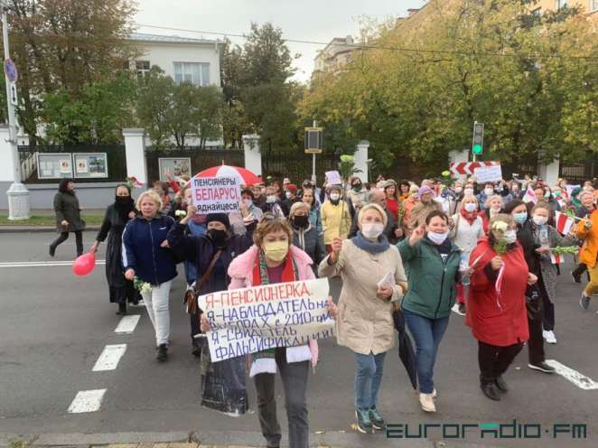 About 200 people on October 5 took part in the street rally dubbed the March of Pensioners in Minsk. They went from Independence Square to Yakub Kolas Square and on the way, they diverted to the Linguistic University to greet protesting students. The pensioners held white-red-white flags and umbrellas, posters. Passing near the building of the Ministry of Internal Affairs, the protesters chanted "[Interior Minister] Karayeu must be put on trial!"