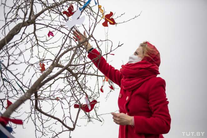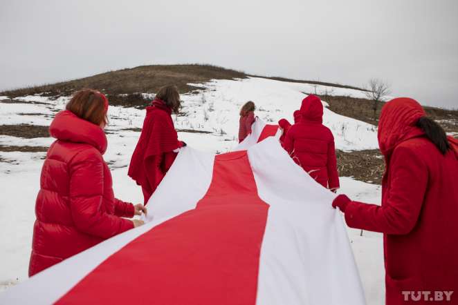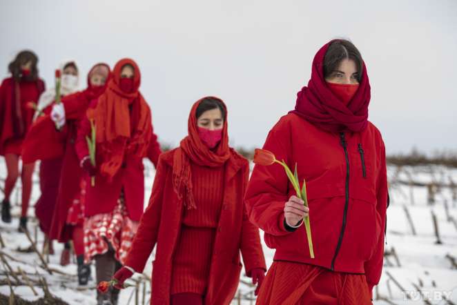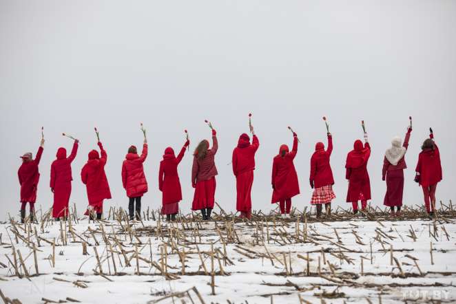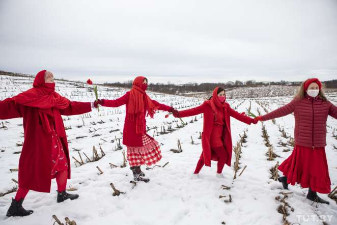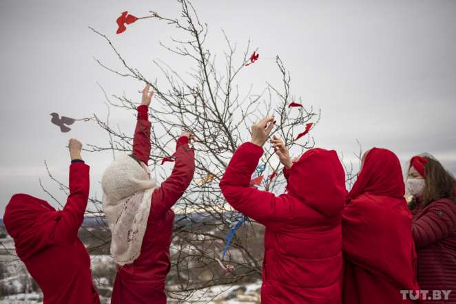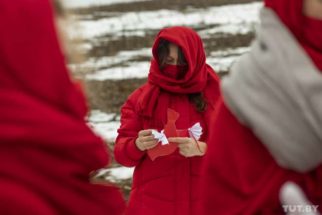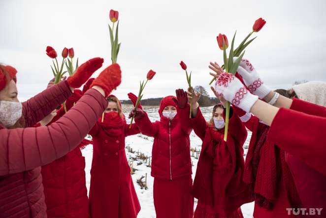 Belarusian women dressed in clothes of national colours, who have become a peculiar city brand, said goodbye to winter in a beautiful spring welcoming celebration last weekend. On the last day of winter, about two dozen people, dressed in red, played round dances, sang “vyasnyanki” – songs calling for spring – and hung colourful paper birds on trees near Volozhin. See what the ceremony looked like in the TUT.BY photo reportage.