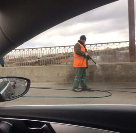 Intex-Press published a photo featuring a worker who washes an overpass connecting Paunochny district and the city centre: