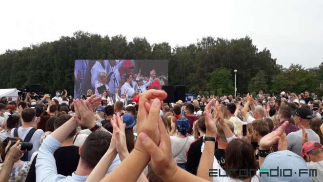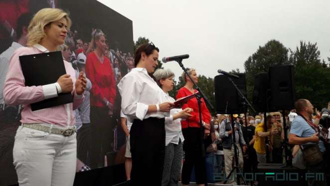 People strongly supported Tsikhanouskaya shouting "Sveta! Sveta". At one point Svyatlana had tears in her eyes from the emotions. The audience listened and reacted loudly with slogans "Freedom!", "Long Live Belarus!", "Victory!" to every word of Svyatlana and representatives of Valery Tsapkala and Viktar Babaryka's teams -- Veranika Tsapkala and Maryia Kalesnikava.