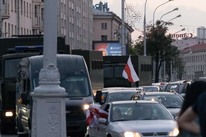 Nadzeya took these photos on August 16 during the Freedom March. Paddy wagons and mini buses without license plates on the streets of Minsk, next to the cars with Belarusians waving the white-red-white flag.