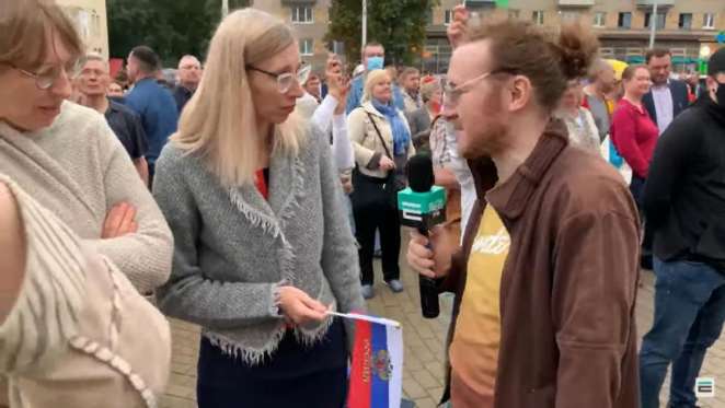 A woman with a Russian flag came to the same rally. In the Euroradio broadcst, she said that in this way she wanted to thank Russia and Putin personally for “supporting us in such a difficult time”. A little later, the woman would take part in the "photo bomb the chief editor of Euroradio” performance.