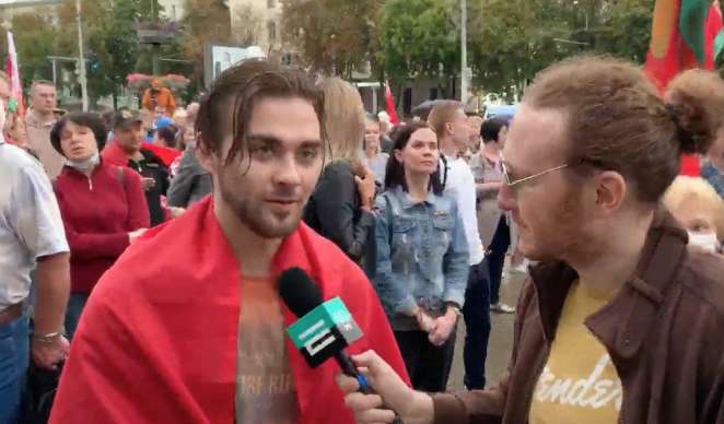 A guy with a national flag on his shoulders was spotted at a pro-government rally on August 25 near Kamarousky market. He told Euroradio online said that it was “civic duty” that brought him to the rally. Being a student, he called himself “a person of state” .