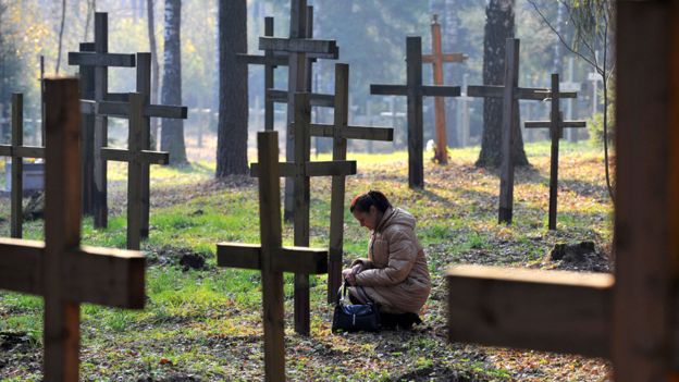 About 30,000 victims of the Stalinist terror are buried there, officials say. But independent historians say as many as 200,000 were shot there by Soviet secret police in the 1930s and 40s.