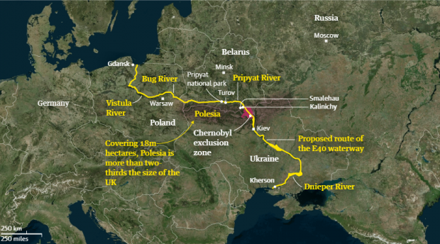 The E40 would stretch from Gdansk in Poland to Kherson in Ukraine, impacting five rivers en route: the Vistula, the Bug, the Pina, the Pripyat and the Dnieper, according to the feasibility study led by the Maritime Institute in Gdansk. At its closest it would pass only 2.5km from the Chernobyl nuclear reactor, potentially contaminating a reservoir downstream that provides water for 2.8 million people in Kyiv.
