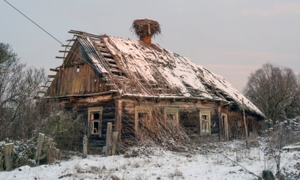 An empty white stork nest rests on the chimney of an abandoned home in Kudrychy