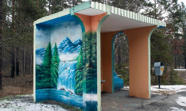 A colourfully decorated bus stop near Naroulia, a town on the border of the Polesia State Radioecological Reserve, which adjoins the Chernobyl exclusion zone