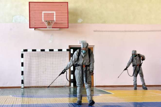 In a school near Minsk during the coronavirus pandemic, workers disinfect a gym | Sergei Gapon/AFP via Getty Images