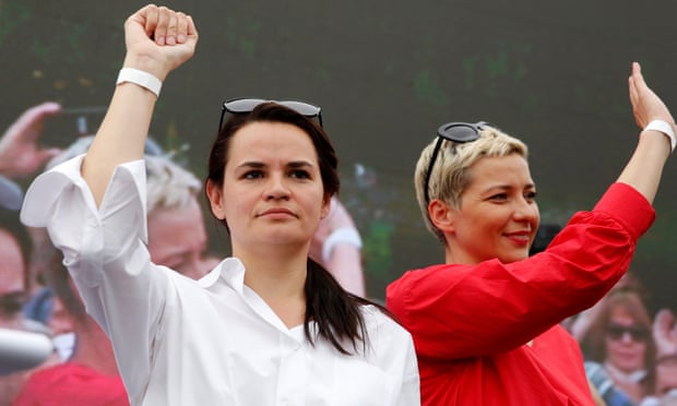 Svetlana Tikhanovskaya, left, with Maria Kolesnikova, a representative of an unofficial candidate Victor Babariko in Minsk on 19 July. Photograph: Tatyana Zenkovich/EPA