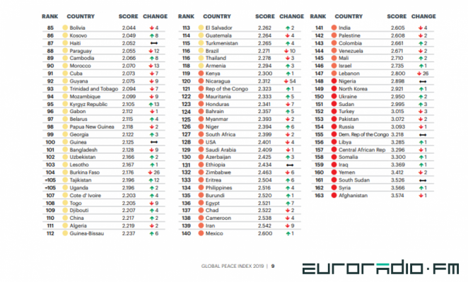 The majority of the 163 states included in the rankings have improved their index. Thus, Global Peace Index 2019 has improved for the first time in five years, researchers of the institute for Economics and Peace concluded.