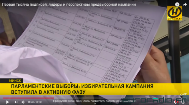 The Belarusian state TV channel ONT on 12 September aired a report about the collection of signatures – a stage during the parliamentary election campaign necessary to put forward candidates for the seats in the House of Representatives. Routinely typical, the broadcast contained however very interesting footage at the beginning of the report, namely some signature collectors holding the sheets with the printed home addresses, passport numbers, work, home and even mobile telephone numbers of voters.