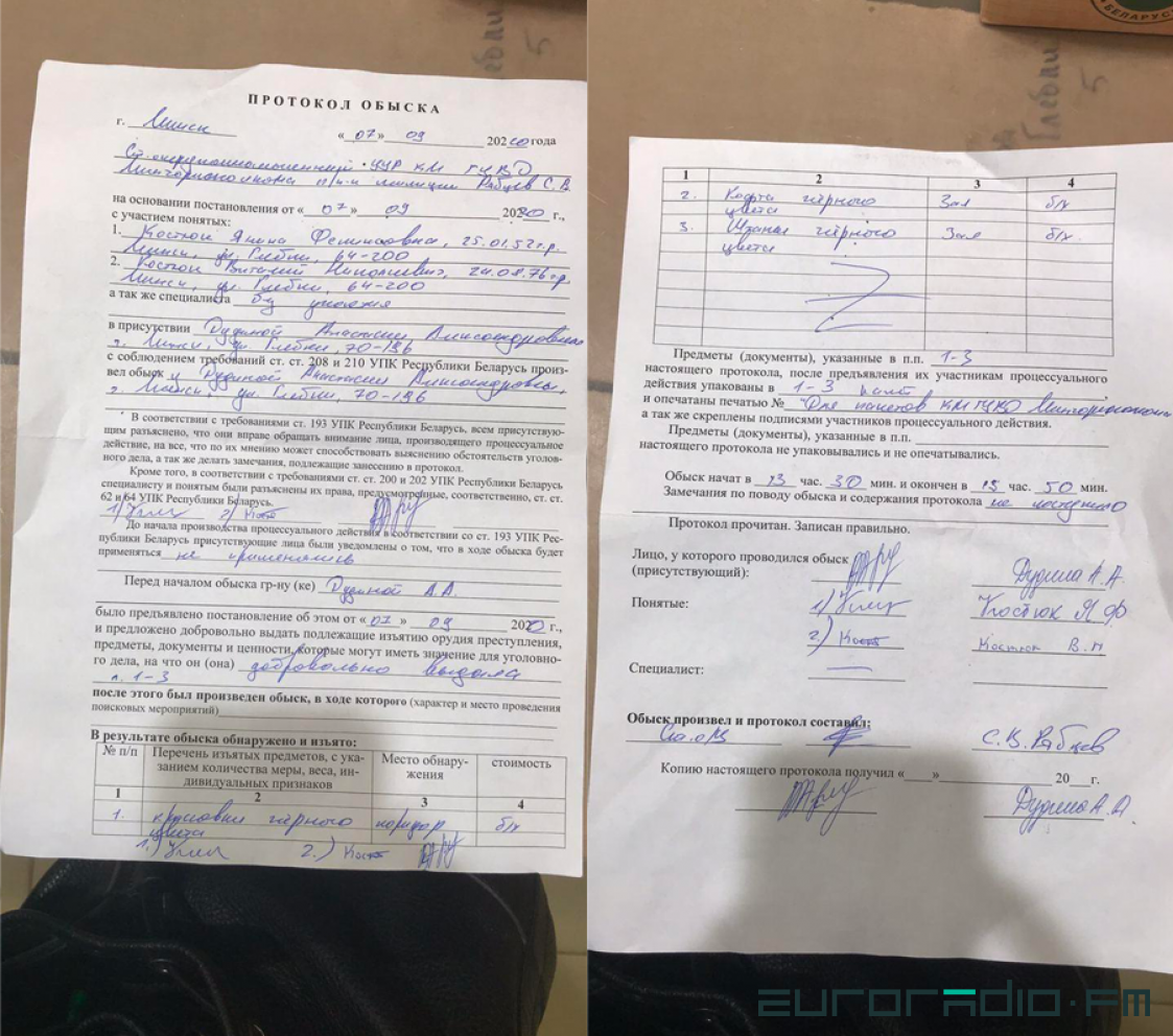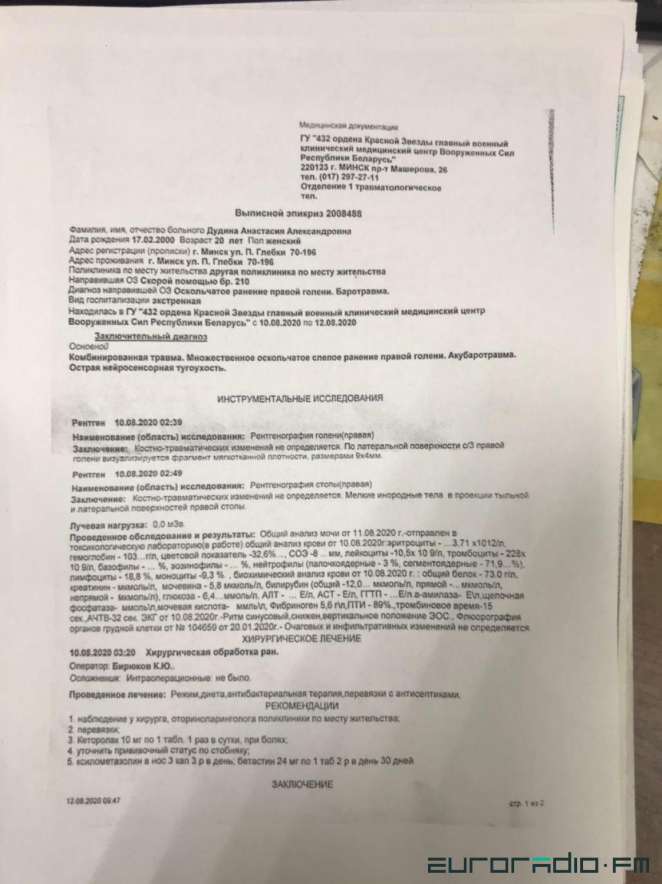 "In the hospital the same night she got visited by an investigator. He asked her to sign something. In the state that Nastya was, she could hardly understand and remember what they asked her to sign," says Nina Sakalouskaya, Anastasiya's mother. "Nastya signed the document. Then the investigator talked to her again, as part of the survey. It was clear that he was an employee of the Ministry of Internal Affairs and that she was being interviewed as a witness."