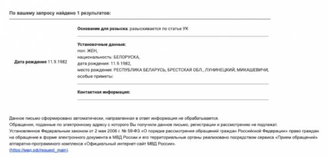 At the same time, the ministry fails to give the reason behind such a step or specify the article of the Criminal Code in accordance with which she is wanted.