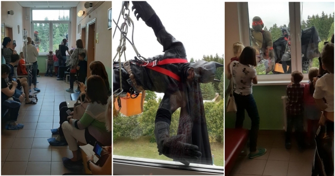 The superheroes though weren’t there to rescue anyone; instead, they cleaned the hospital windows and waved to on-looking little patients.