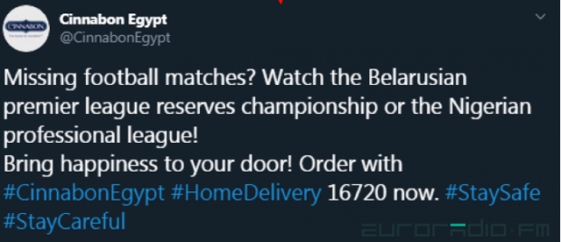 You won't believe it: the official Cinnabon account in Egypt urges to buy their sweet pastries to watch the matches of the Belarusian Premier League.