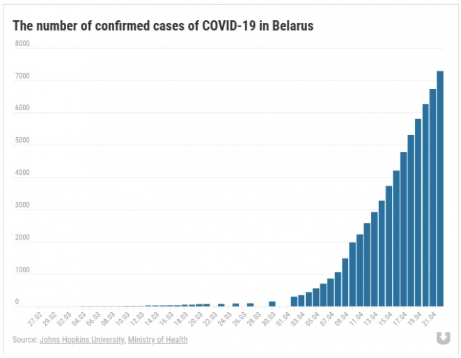 As of 22 April, 7,281 cases of COVID-19 have been registered in Belarus, the Healthcare Ministry reports. Thus, a daily increase of infected people is 558 new cases.