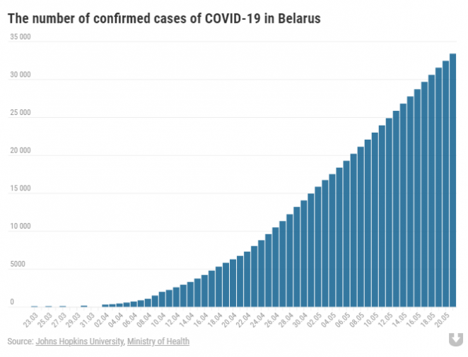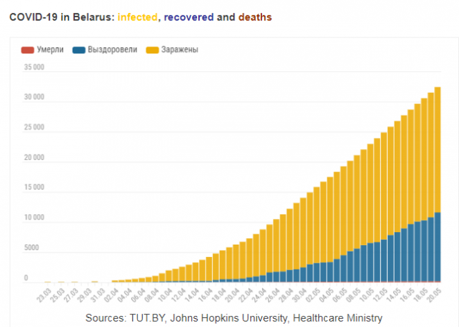 Recall that the projected trend of a 300-400 cases daily increase and the peak incidence in early May have proved wrong. On 14 May, Infection Deputy Healthcare Minister Yelena Bogdan said that Belarus has reached a plateau on the infection.