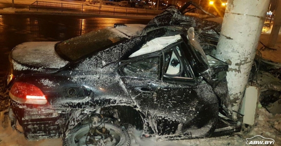 Во время ночных гонок по Минску BMW врезался в столб. Водителя забрала “скорая“