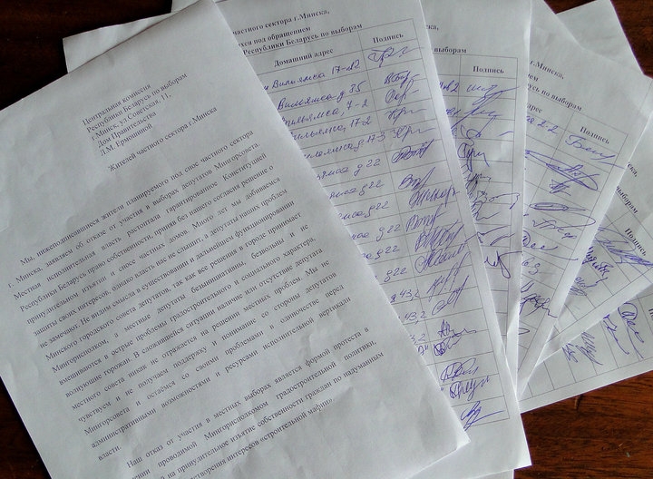 «Мы, нижеподписавшиеся жители планируемого под снос частного сектора г. Минска, заявляем об отказе от участия в выборах депутатов Мингорсовета. Местная исполнительная власть растоптала гарантированное Конституцией Республики Беларусь право собственности, приняв без нашего согласия решение о принудительном изъятии и сносе принадлежащих нам частных домов.