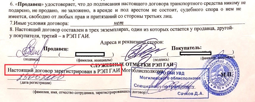 Закон не запрещает продавать аварийные автомобили, при этом общий порядок всех процедур сохраняется: сверка номеров, получение "транзитов", заявление и т.п. Выполнив предписанные Указом Президента РБ №504 действия, Юлия получила транзитные "номера" и копию договора со штампом ГАИ.